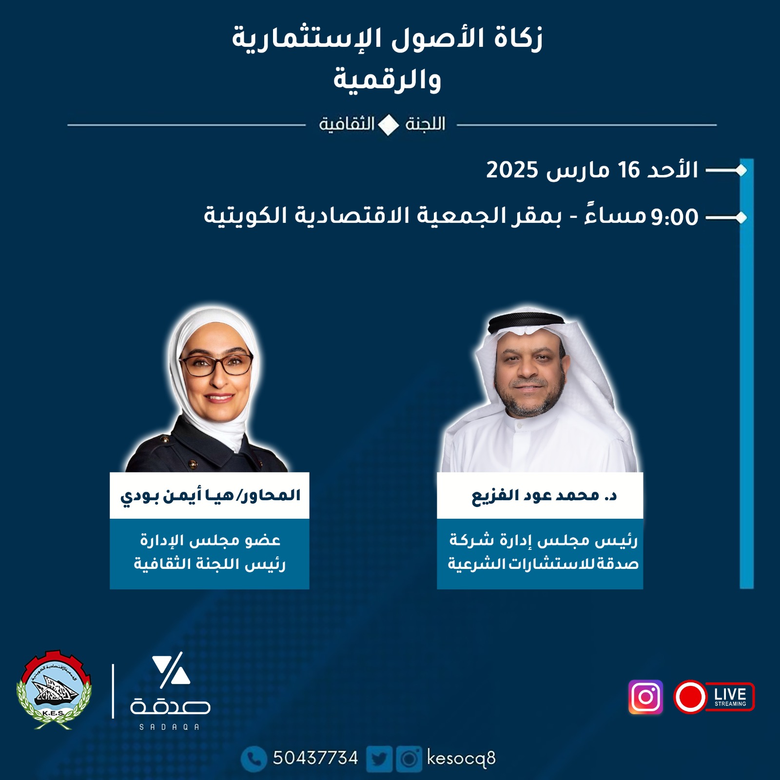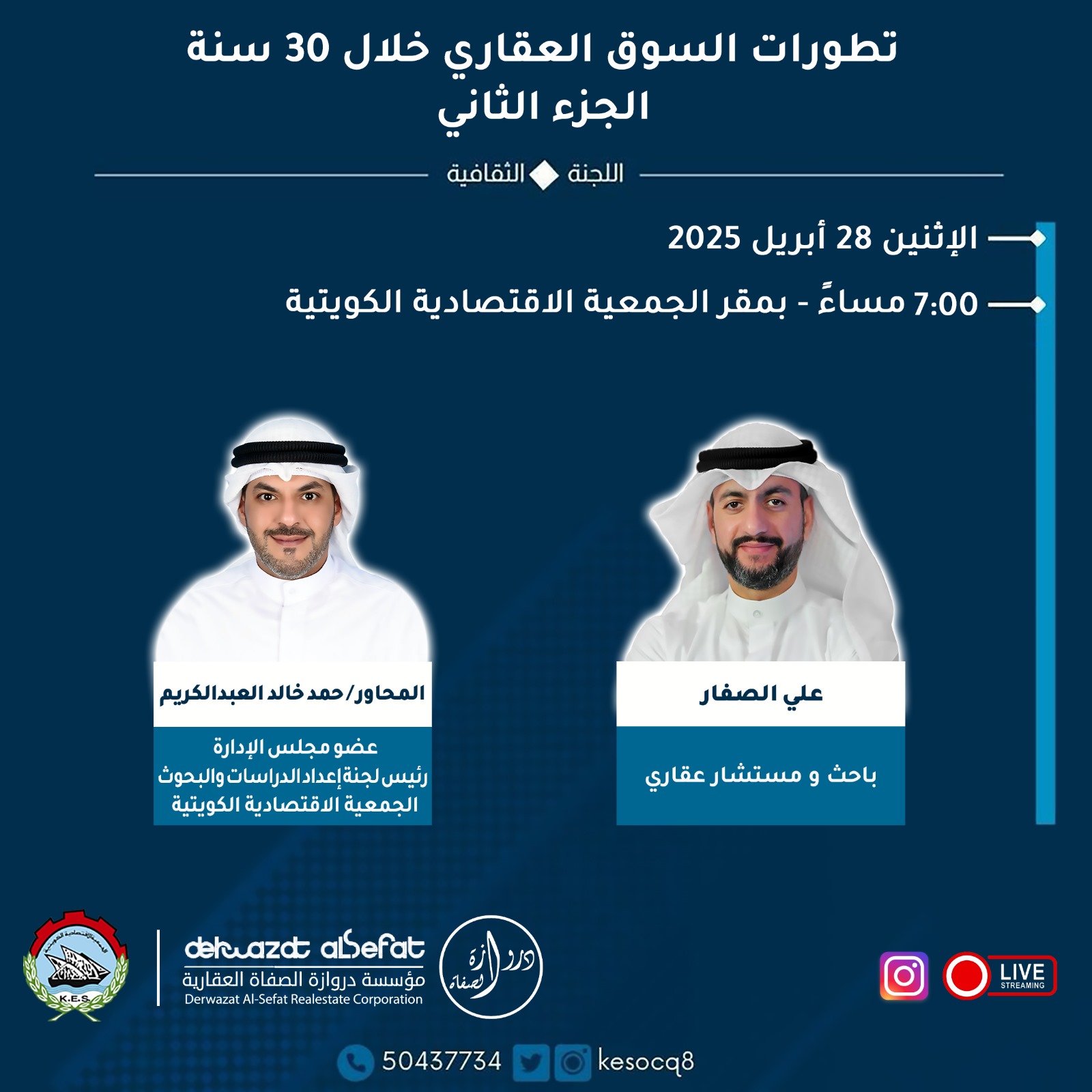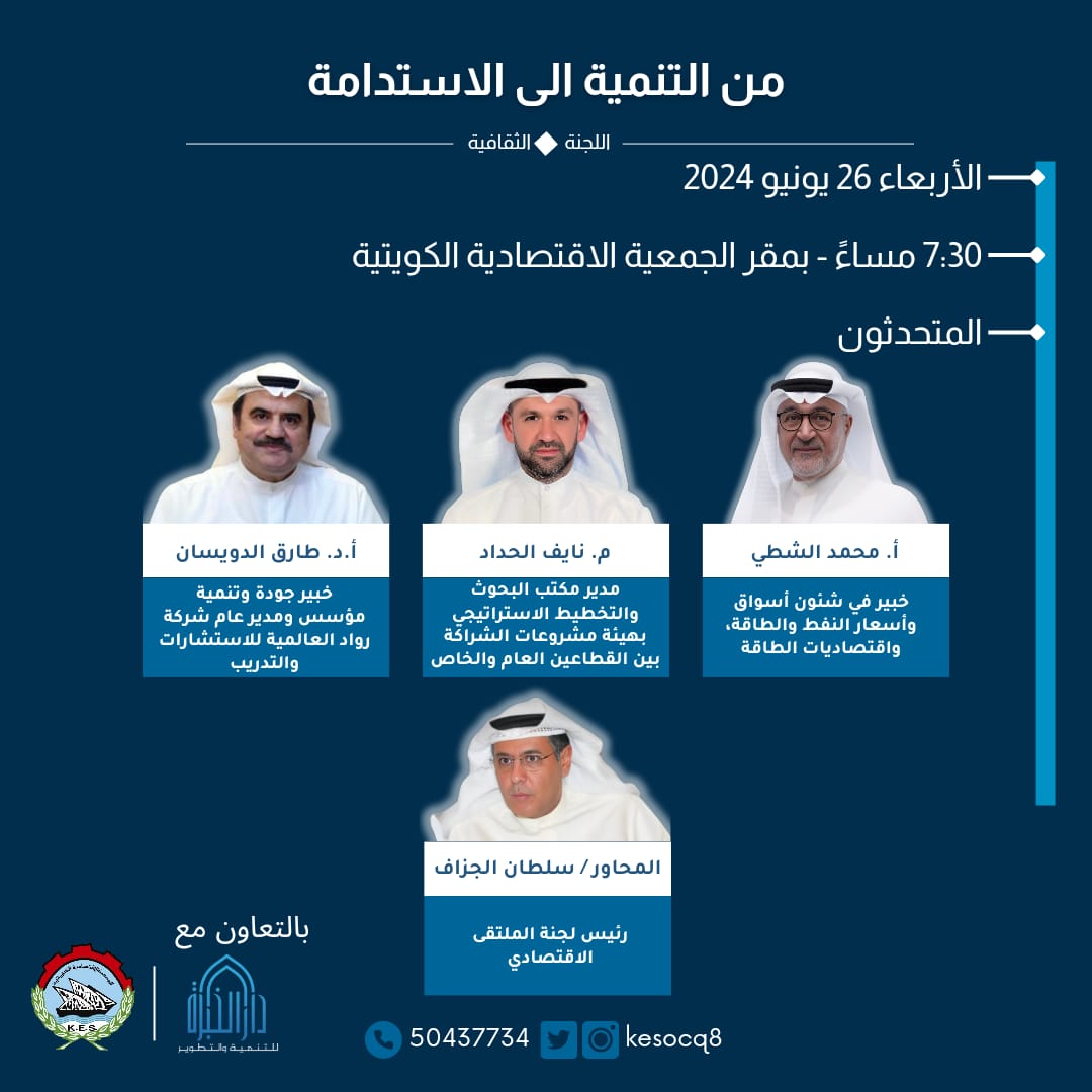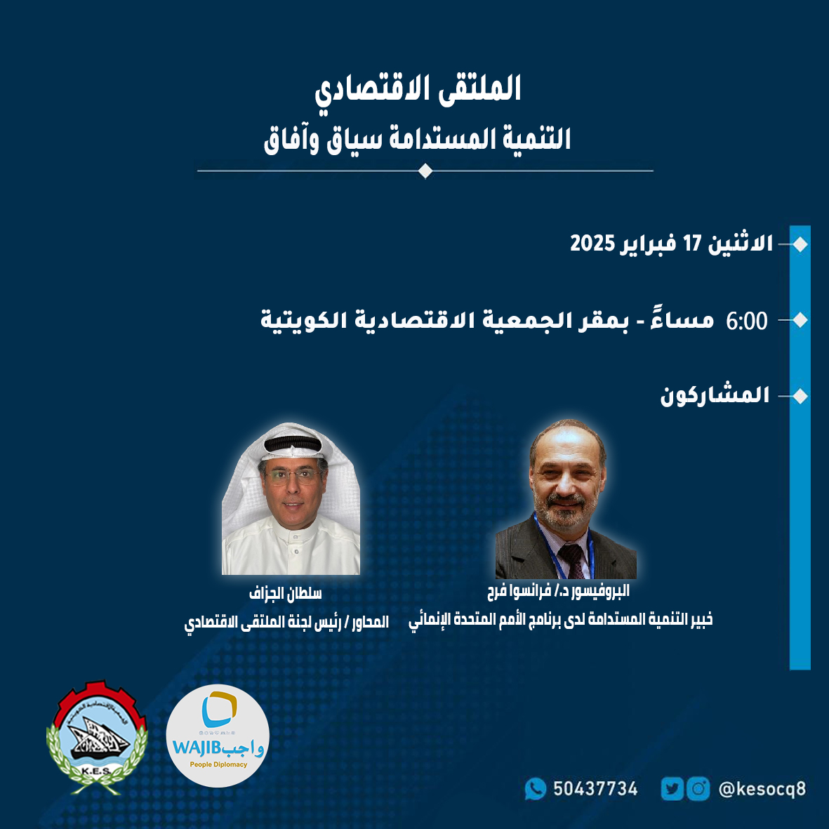 تقوم الجمعية من خلال الديوانية الاقتصادية باستقطاب العديد من الشخصيات من داخل الكويت وخارجها لبحث مواضيع الساعة ذات الأهمية للشارع الكويتي، لاسيما ما يخص قضايا الاقتصاد والمال والعقار والنفط، إذ يتم تداولها في الديوانية بأسلوب حواري بسيط ومباشر بين الضيوف وأعضاء الجمعية، ويترأس هذه اللجنة السيد / سلطان مساعد الجزاف