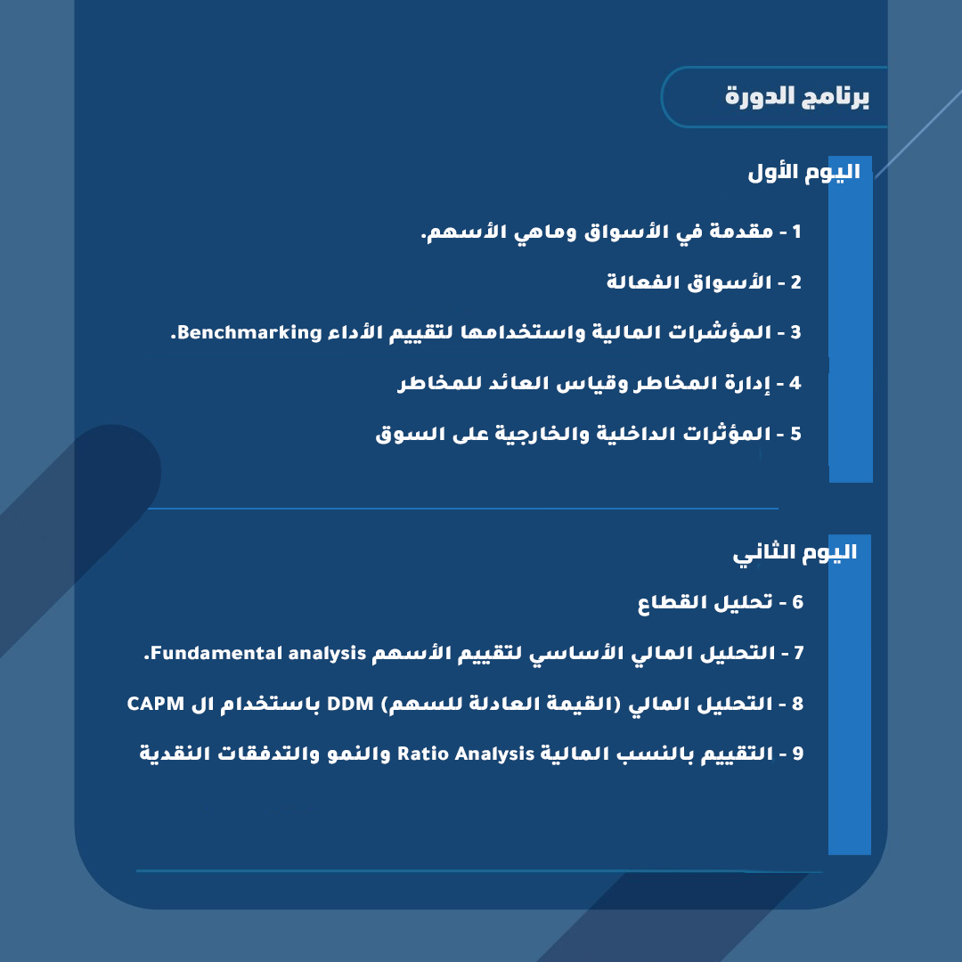 This interactive program was prepared with clear steps and practical applications so that it qualifies the trainee to make investment decisions and enables him to analyze stock trends, estimate expected returns, determine stock risks, and train participants on the basics of successful stock evaluation through the use of basic financial analysis and analysis of financial ratios to compare risks and returns and determine the expected growth for each stock. . The program contains realistic training methods to hone the trainee's stock valuation skills. Participants will be trained in basic financial analysis to evaluate the fair value of the stock and the company’s actual performance by reading the balance sheet, income statements, and financial ratios and determining the fair value of the stock.